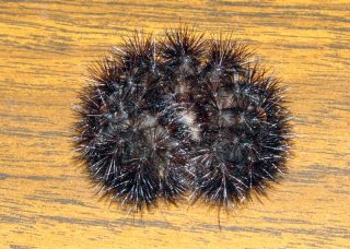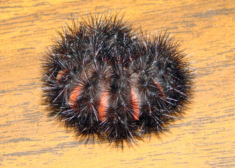 Photography note: exposing a dead-black spiny thing against a woodgrain desktop is basically impossible. The desktop is grossly overexposed so the Wooly Bear details come out more-or-less visible. Ugly, but you get the idea.