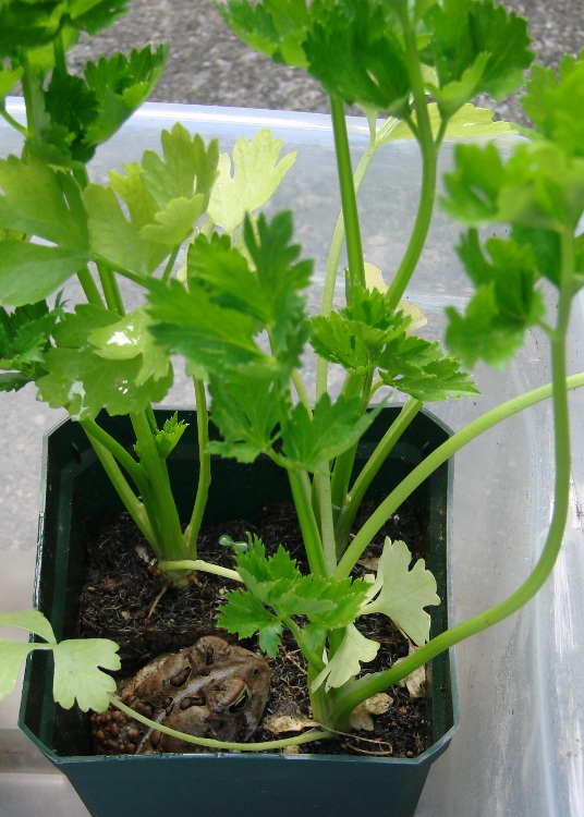 Mary left a plant starter pot on the patio overnight and found an unexpected resident when she picked it up: a toad tucked neatly into a vacant cell.