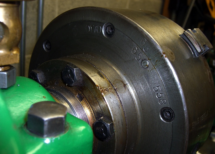 Making note of the witness marks on the backplate and chuck body, I removed the body. Fortunately, there was just enough clearance between the front bearing journal and the backplate that I could get the bolts out without dismantling anything else.