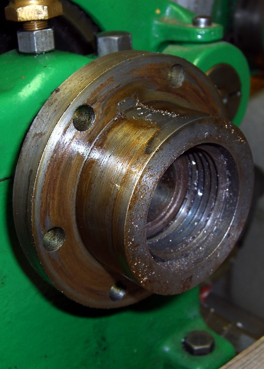 That left me with the rather grody and still firmly stuck backplate. The bolt disk was brazed onto the threaded cylinder with a keyway. Although the chuck body had a key slot, it looks like the matching key had been machined off of the cylinder, so the bolts were taking all the cutting torque. Worked OK for both the previous owner and for me, so I suspect it’ll continue to work just fine for the next owner, too.