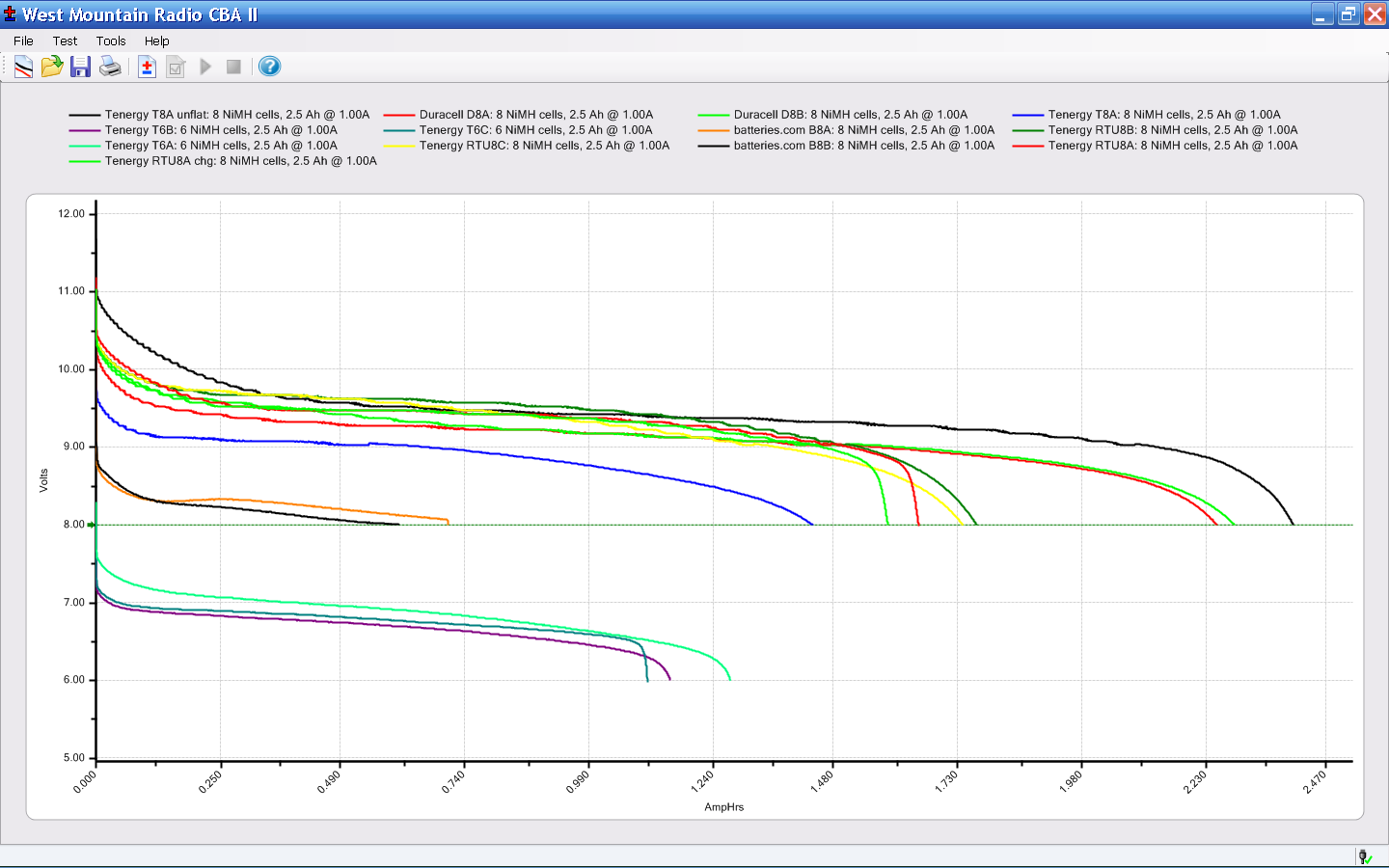 The black curve to the far right near 2.47 Ah is a freshly charged set of Tenergy 2.6 Ah cells that had been oops discharged completely flat. Other than this run, the Tenergy cells have been a major disappointment: the 6-cell packs near the bottom are running less than half their rated capacity and the 8-cell pack in blue isn’t much better.