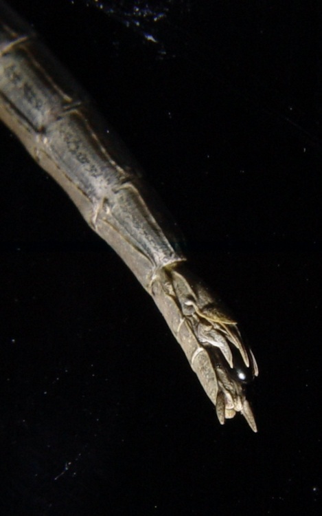I caught this egg just before release, aiming through the glass wall with an LED flashlight for illumination, through close-up adapters on a DSC-F717 on a tripod. A bit of fiddly image editing got rid of most of the “stars” caused by dirt on the glass, but the insect and egg aren’t edited.