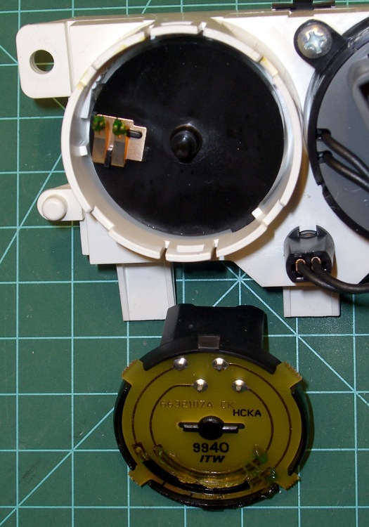 Taking the control apart reveals that it’s a potentiometer with some switching contacts. The two bifurcated spring-finger contacts on the black plastic disk short the resistive element to the inner metallic track.