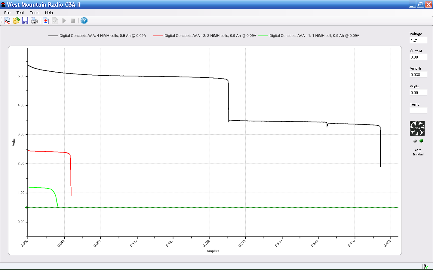 The AAA cells I mentioned there bubbled to the top of the heap on my desk again, so I charged them, let them sit around for a few days to stabilize, then ran a discharge test.