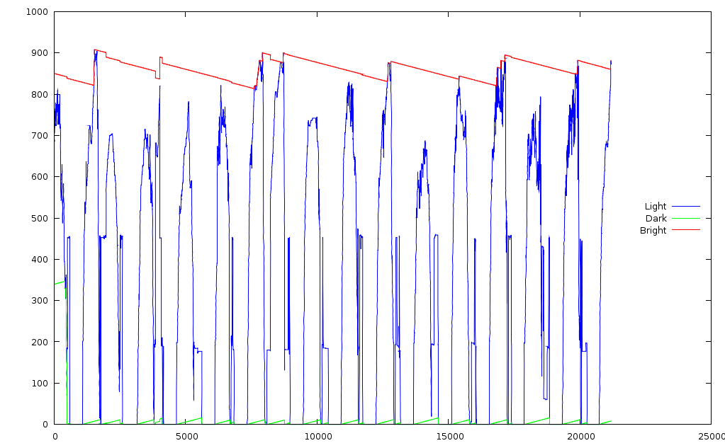 Here’s about three weeks of light intensity record. The red trace is the max value, green is minimum, and blue the current intensity. The min and max tend toward the middle, one count per hour, so they don’t stick at the extremes.