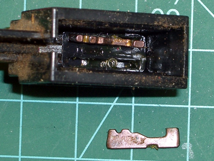 The problem turned out to be, as expected, congealed grease inside the switch. The black gunk on the right halves of the copper contacts was essentially solid; you can see that it formed a nice insulating layer. I cleaned that out, polished up the moving contacts, reassembled it, and … the switch still didn’t work.