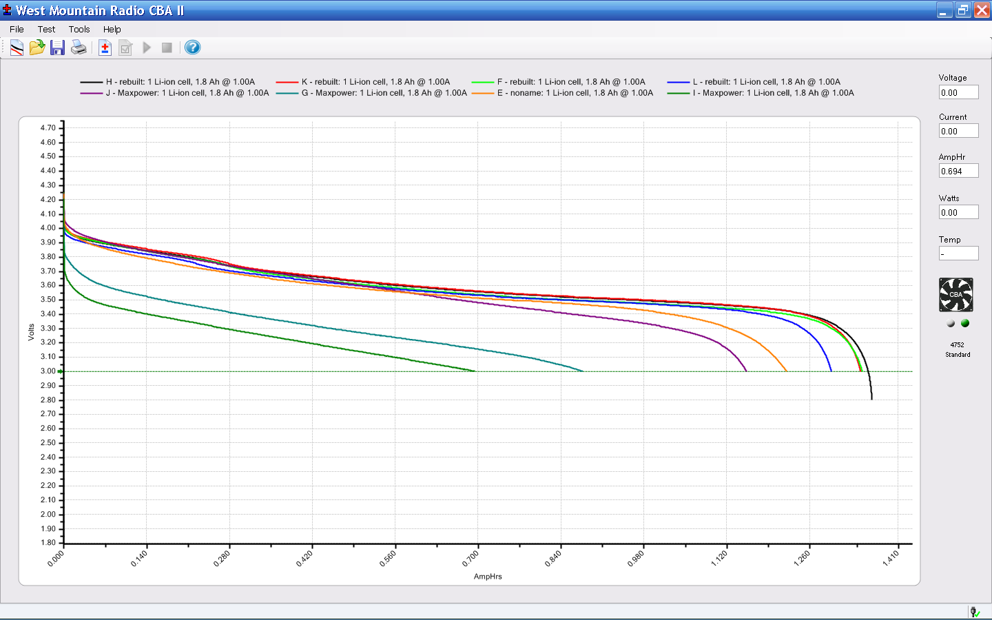 The rebuilt packs now have cells from batteryspace.com that are working fine: nominal capacity 600 mAh, actual around 1200 to 1400 for a parallel pair. It’s surprising to see a cell producing its rated capacity…