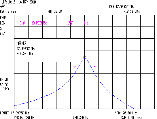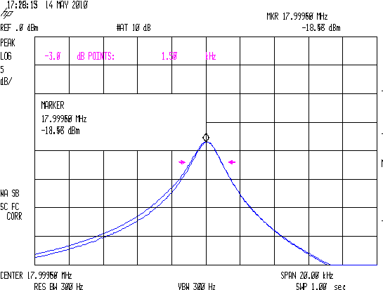 The resonant frequency is now 17.99968, 180 Hz higher, which may be due to instability in the HP8591 spectrum analyzer’s not-stabilized-for-ten-hours ovenized oscillator. The bandwidth is 1.55 kHz, 50 Hz wider, although I think that’s one resolution quantum of difference.