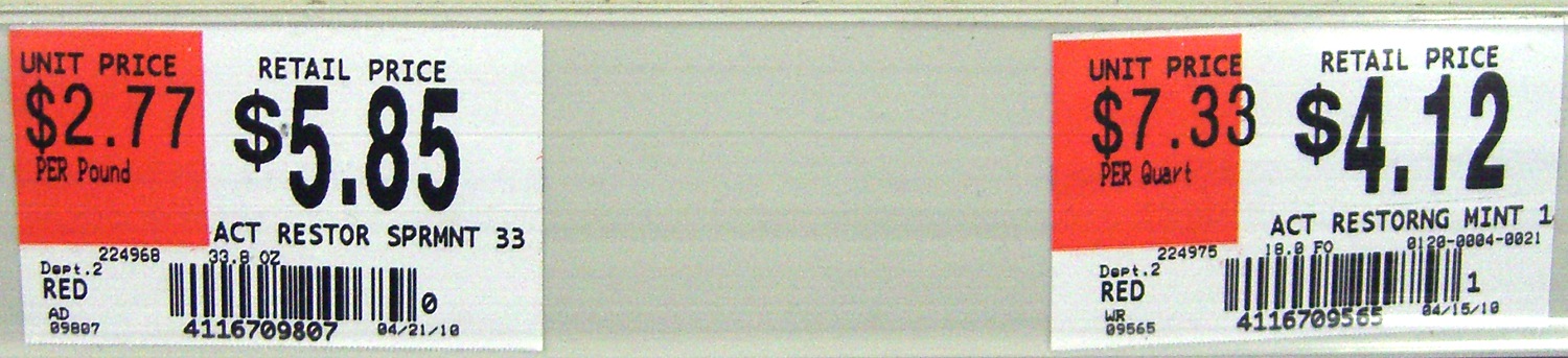 Here are the two shelf labels for two sizes of the lah-dee-dah fluoridating remineralizing mouthwash that our young lady must use for the next few years. The unit price is in the orange block, with some fine print underneath giving the unit. Click for a bigger image; you’ll probably need it.