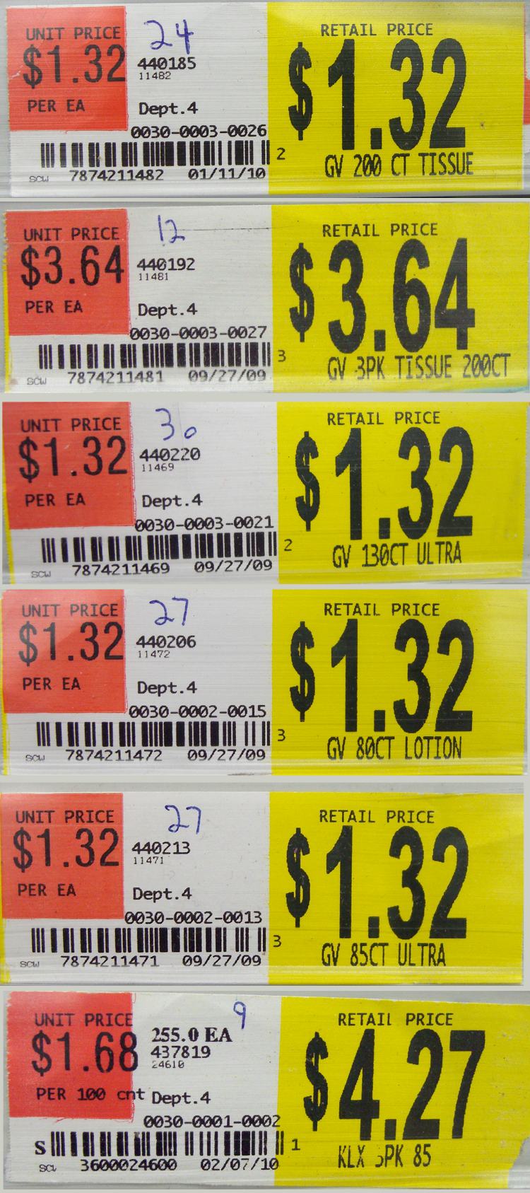 - The bottom label is for a name-brand tissue that’s unit-priced per sheet.