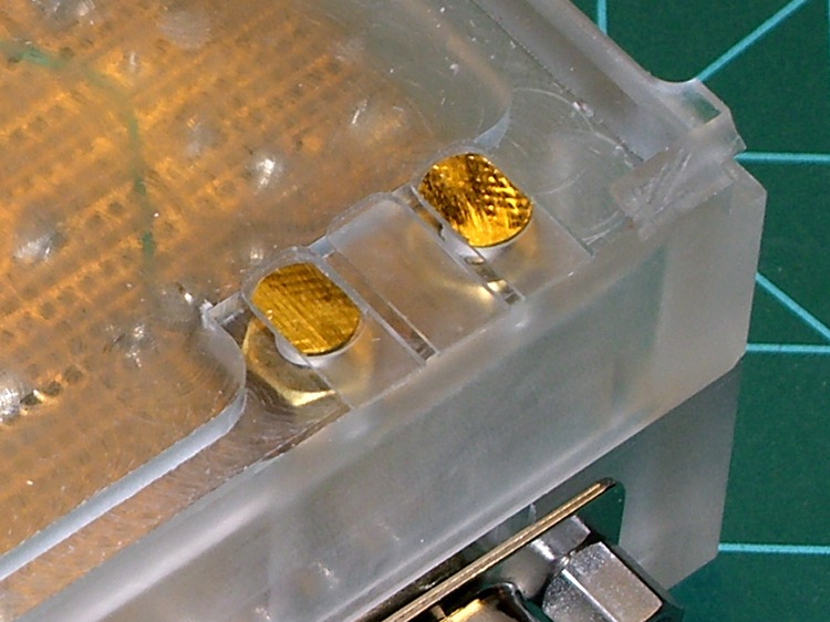 The case for this gadget slides into the back of the ICOM IC-Z1A HT and powers the radio through its usual battery contacts. I reshaped 5/16″ 4-40 brass machine screws into flat-top studs, then soldered 8-mil tin strips to their tops.