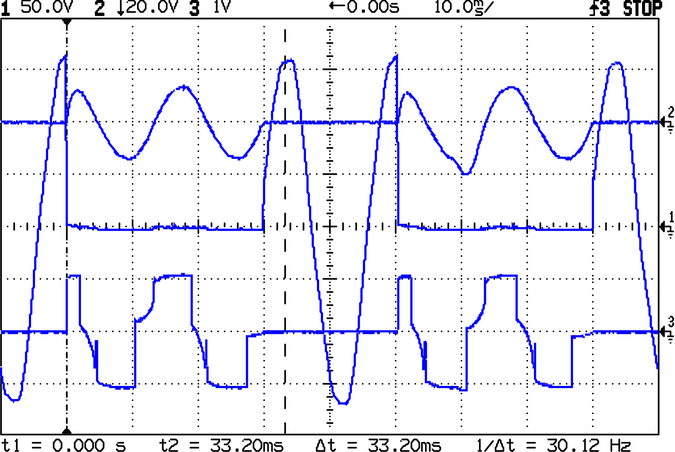 I wanted to show how triacs behave when they’re controlling highly inductive loads, which the (unloaded) transformer certainly is. So I built a controller around an Atmel AT89C2051 (the good bits of an 8051 stuffed in a 20-pin DIP) that gave complete source/sink control over the gate current in 1/8-cycle increments during six complete cycles. The left side of the picture therefore has some custom circuitry to make all that happen.