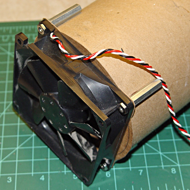 A quartet of board spacers screwed into 90-mm (92-mm, whatever) fan fit neatly around the mailing tube’s OD, where I simply hot-melt-glued them into place.