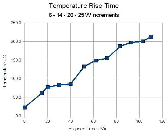 Just for the amusement value, I applied 22.5 W to the extruder and recorded the temperature every 10 seconds for the first 1200 seconds. I’m not going to graph it, but the salient points are: