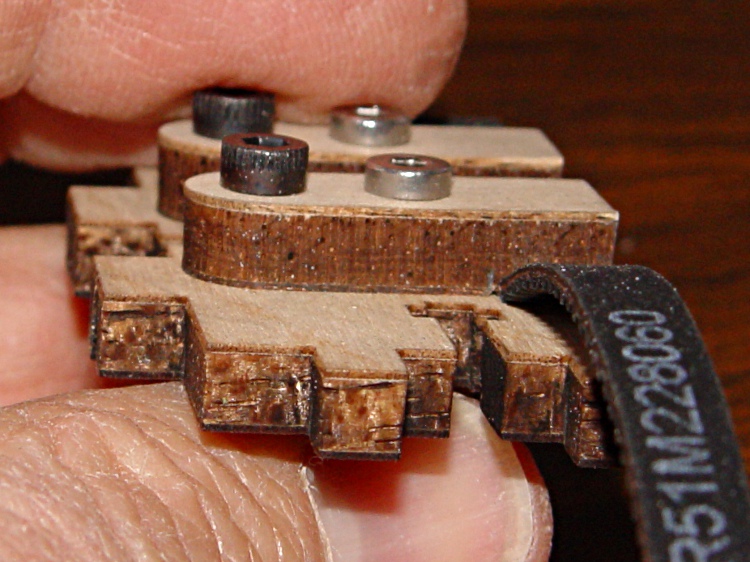 The laser-cut plywood clamps holding the timing belts to the drive ribs slant diagonally across the rib + belt and secure one edge of the belt.