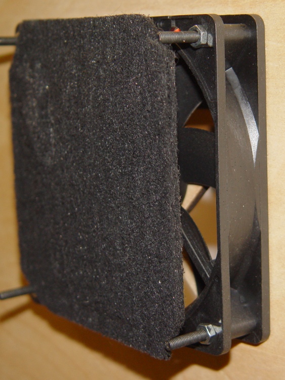 The key step is to add the fan provided with the TOM (which they recommend you don’t use!): outside the box, oriented backwards, and running on +5 V instead of +12 V. The general concept: free up some precious space inside the box, shove the exhaust through a filter, and do it with a gentle breeze rather than a mighty blast.