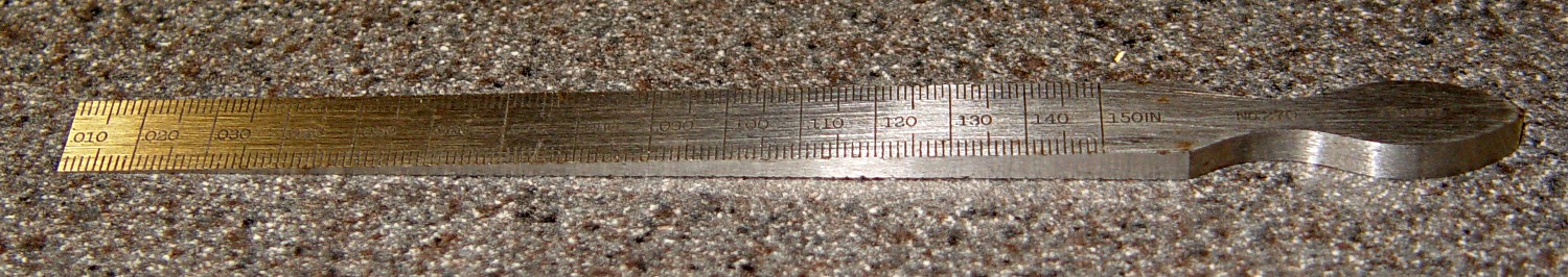 Other possibilities: a homemade sine block using a steel ruler and a piece of drill rod; a leaf-style thickness gauge; or possibly one of the small keychain-style sparkplug gapping tools that includes a linearly increasing width gauge wrapped around the perimeter. Or for Ed’s purposes, take the z-height indicator off the Sherline and stick it on this for long enough to test the height. But the Starrett thickness gauge is sure an elegant solution.