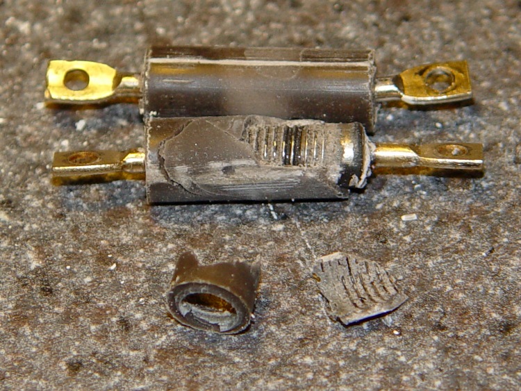 The bottom core was still firmly attached and disintegrated as I forced it out, which means it was in good condition. Paradoxically, the crumbled resistor core in the picture came from the resistor in the best shape.