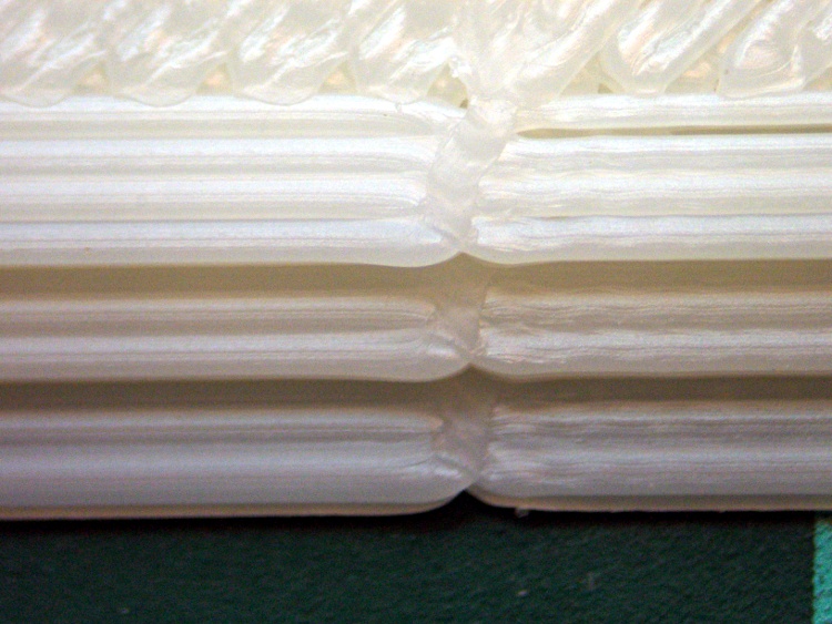 You’re looking straight down at three edges (bottom = 2 layers, middle & top = 3 layers), but the shadow obscures the vertical faces; they’re firmly joined. The nozzle enters the picture from the left, slows and stops at the joint, then departs for another location.