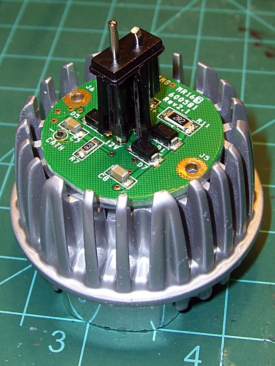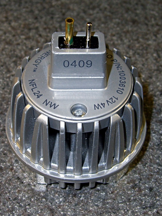 I picked up a pair of 12 V 4 W 3-LED floodlights (datasheet, newer datasheet, and catalog) with 34 degree and 24 degree beams from All Electronics, with the intent of making some task lighting fixtures for the shop. Somebody decommissioned the lamps by snipping off a pin, so they’re not immediately useful.