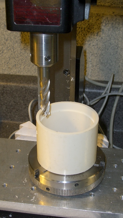 I sawed off a length of PVC pipe, faced off the ends in the lathe, then CNC milled a recess to clear the male threads on the gooseneck part (I hate precision boring in the lathe). Given the rather tenuous grasp of that 3-jaw chuck, I made two passes around the perimeter: pipe ID 52.1, thread OD 54.5, remove 1.2 mm all around, about 9 mm down.