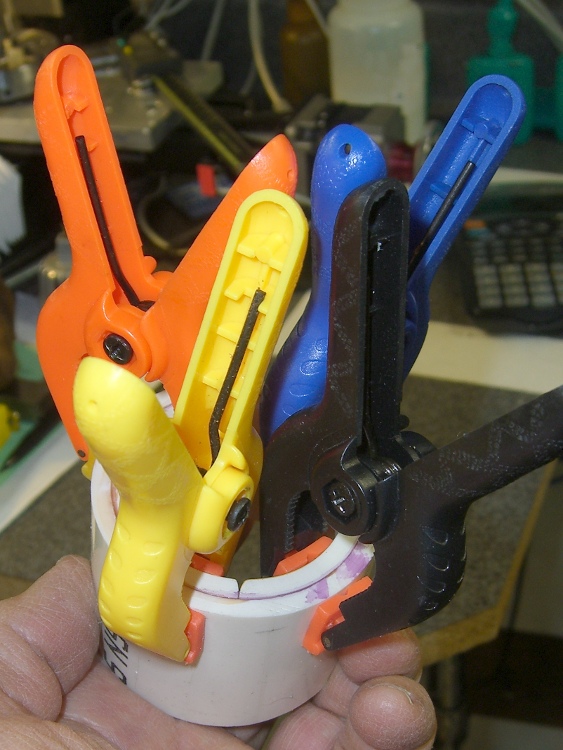 Apply a heat gun to the inner ring until it’s soft enough to stuff into the pipe, clamp it until it hardens, apply PVC cement, and clamp overnight. Contrary to appearances, the ends of the two pipes are flush at the surface. Once again, you cannot have too many clamps: