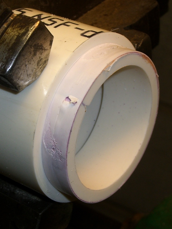 Turning down the outside to fit the threads shows just how little meat was left on that pipe: