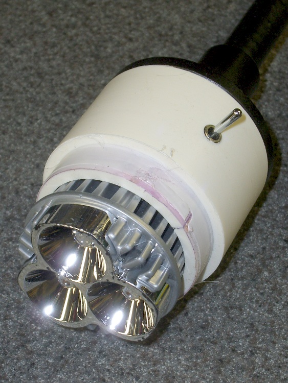 The glass lens on the front fits in a molded holder with an annular air gap. The LED lamp housing has all those fancy cooling fins against the inner pipe, so there’s a bit of cooling air flow around the lamp and out through the rear black section. A thermocouple reports the lamp temperature gets up around 75 °C in a 14 °C shop; a 50 °C rise might be a tad warm in the summer, but we’ll see what happens.