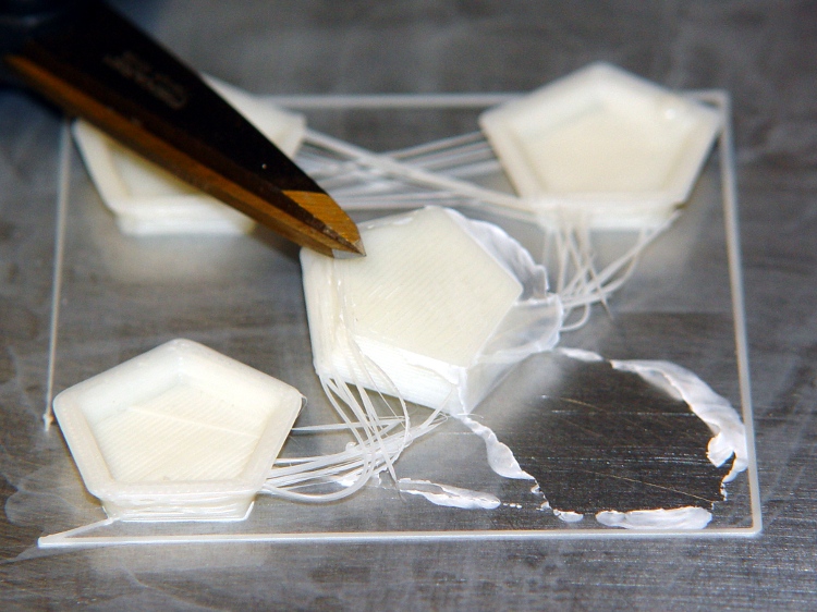 Trying to start pasting the filament with the nozzle moving doesn’t work well, as witness the left edge of the outline around these test pieces:
