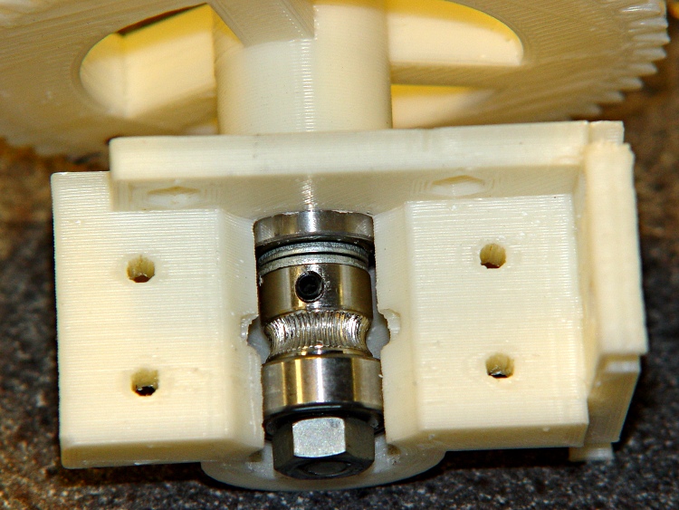 I enabled the option to put a 5 mm diameter cleanout hole in the bearing housing, which turned out to be absolutely essential for monitoring the location of the drive gear inside all the machinery. You can barely see the hole in the first picture, on the left side of the curved section.
