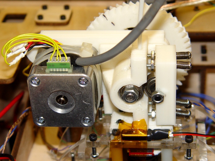 A floating shaft means the 7-tooth motor drive gear’s position must line up with wherever the 51-tooth filament drive gear happens to be. There’s not much room to adjust the motor gear, but a few iterations sorted out the proper number and placement of all the filament drive shaft washers, nuts, and bearings.