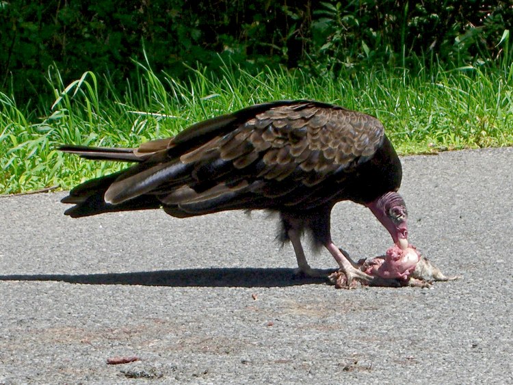 At the big IBM campus just outside of Boulder, there are a lot of deer trying to cross a fairly major road. I was riding my bike up there once and saw a deer that had been hit, off in the ditch right in front of IBM, with three buzzards working on what was left. Those are *big* birds, and they were less than impressed by me and my bike. They didn’t even move and I had to swerve out of the median into a traffic lane to avoid running into one. I wasn’t about to tangle with it, since when I was working at a raptor rehabilitation place they did a demo on how quickly a buzzard can strip a turkey leg clean to the bone with its razor-sharp beak.