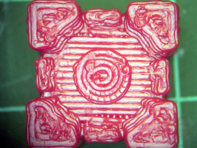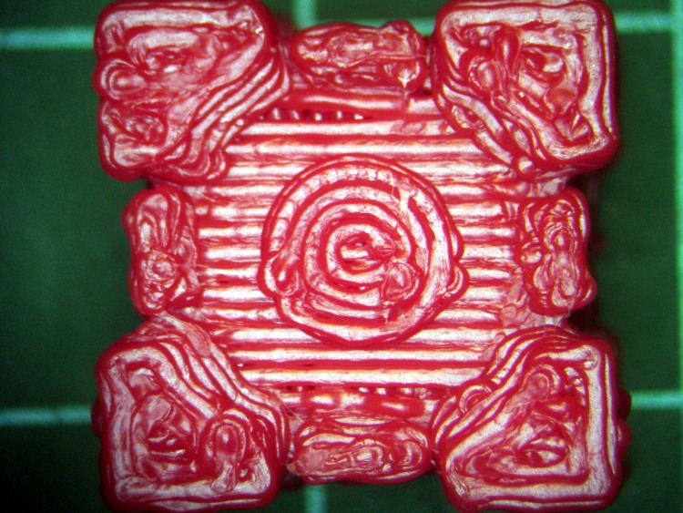 They’re scaled to about 16 mm on a side, making them about as small as anything you’d want to print. With a 0.66 mm extrusion width (0.33 mm thick and 2.0 w/t, they’re only 24 threads wide, which doesn’t allow for much detail. Here’s the top of one printed at 25 mm/s: