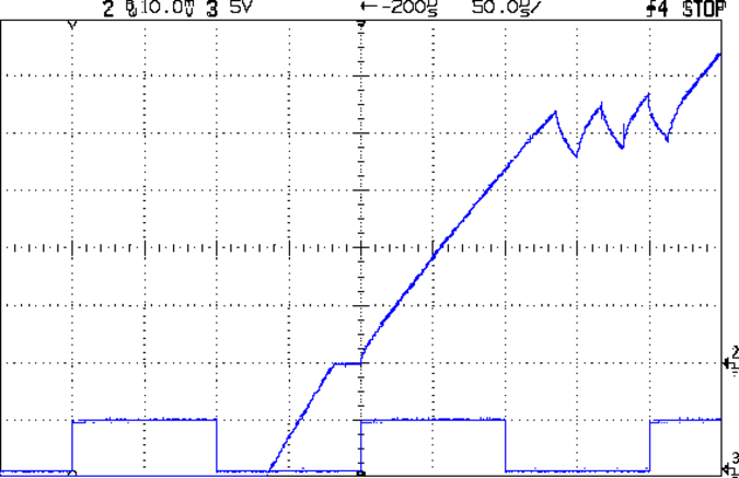 Here’s how the stepper drive voltage affects the current rise, using that kludge to sync the scope on one of those motors with L=2.6 mH and R=2.2 Ω. The peak winding current is 1 A, so the first step current-limits at 200 mA.