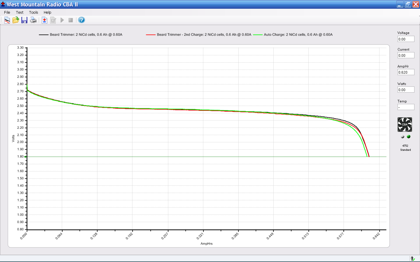 Lookee that! The cells still deliver their rated capacity, even though they no longer worked with the stock charger. I repeated the slow-charge and discharge trick, which produced a perfectly overlapping trace.