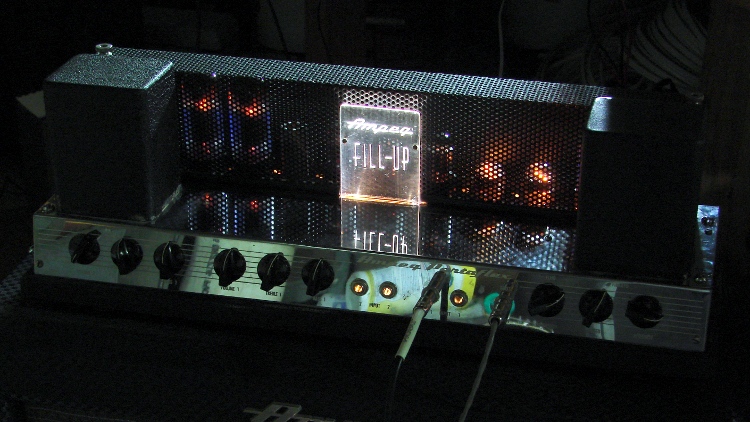 With all those in place, the firebottles lit up properly, the power tube plates remained dark, and it sounded great. The edge-lit engraved acrylic panel in the middle is a wonderful custom mod!