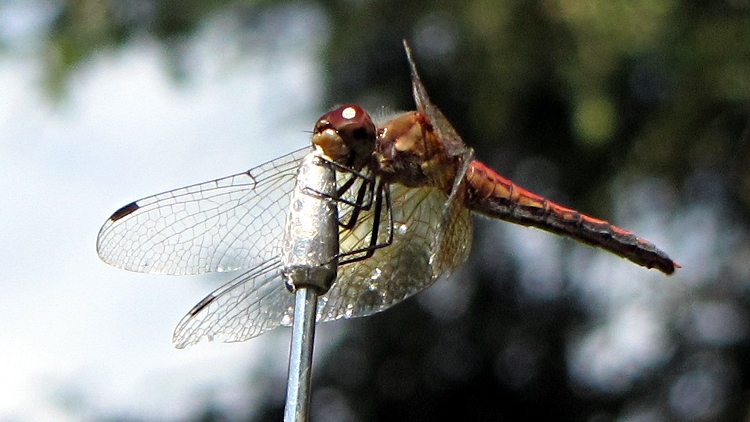 This dragonfly decided that the tip of the 2 m / 70 cm antenna on Mary’s bike was the best place around to survey the area; it periodically zipped off to snag a meal, then returned to stand watch again.