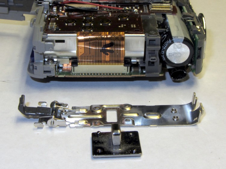 Then the side plate comes off, which requires maneuvering the spring-loaded battery latch out of its recess, at which point the lug for the carry strap will fall out: