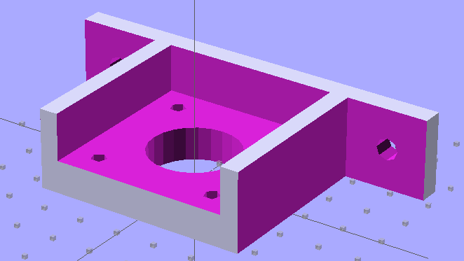 My first pass at the NEMA 17 motor mount bracket used additive modeling, glomming together several blocks made from cube primitives: