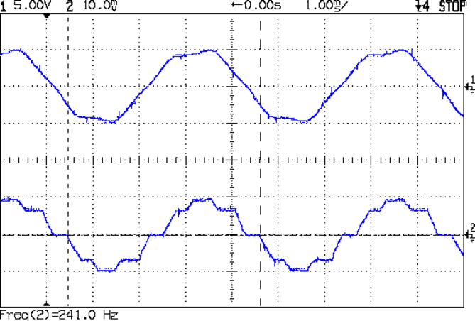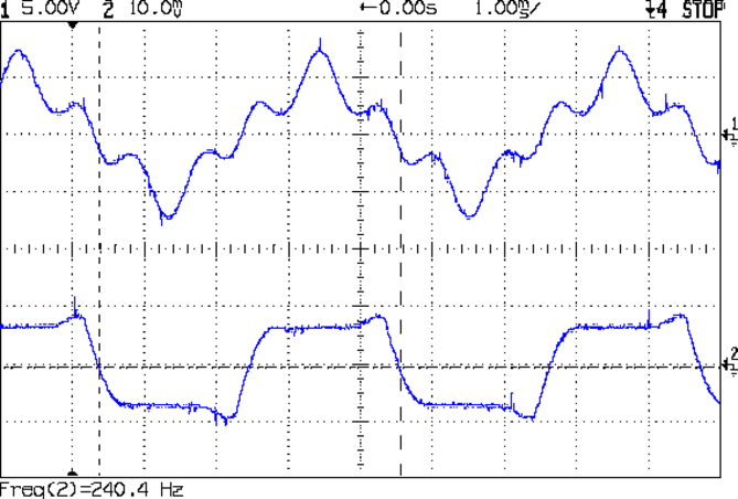 [Update: top trace is voltage from big stepper-as-generator, bottom is small stepper winding current = 1 A/div.]