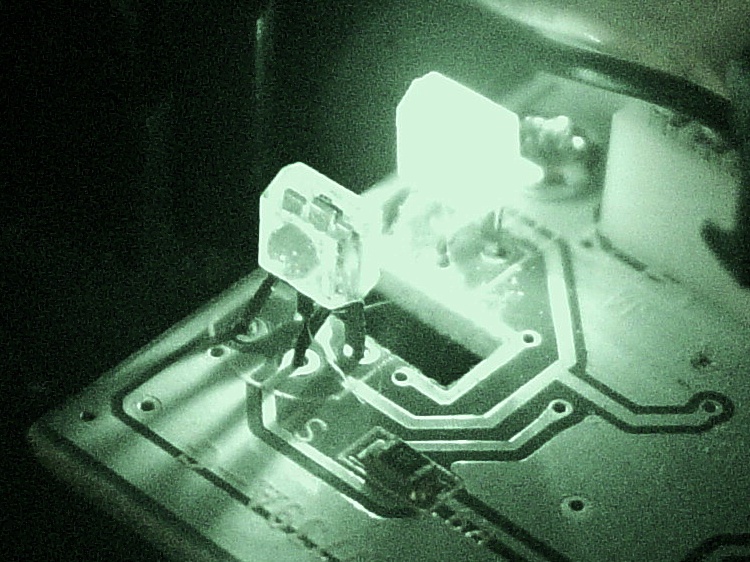 Now, what’s weird about that setup is that the detector lens seems to be pointing in the wrong direction: away from the emitter’s lens. You know it’s the detector because it’s tinted: there’s no point in filtering the emitter’s output (although I have seen gray-tinted IR LEDs, which I think is just to mark them as different from visible LEDs). Here’s proof: a pure IR picture from my Sony DSC-F717 in Nightshot (a.k.a. IR) mode through a Hoya R72 visible-block filter: