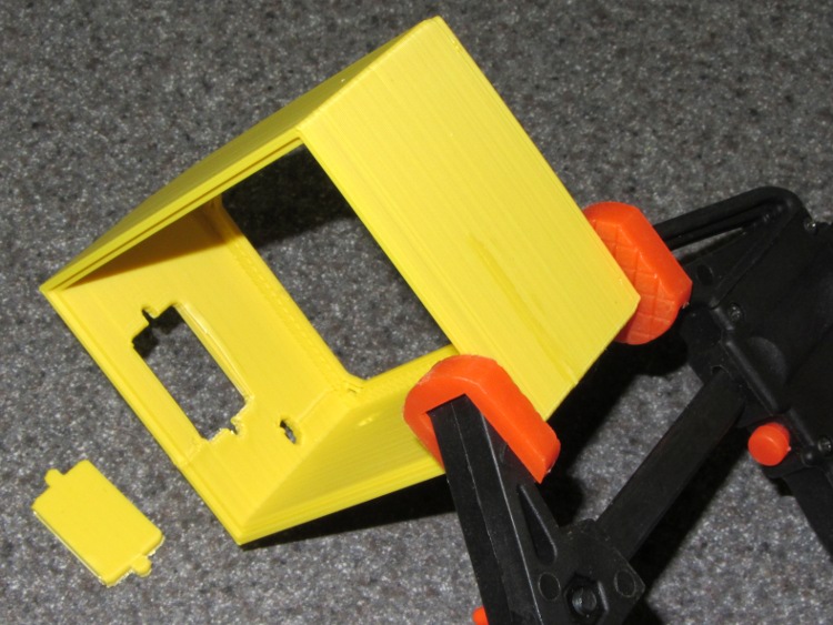 ABS plastic shrinks as it cools and large objects with thin sections tend to delaminate, as seen in the Barbie Pistol and a few other objects. The box for the GPS+voice interface is four threads thick and 35 mm tall, which provided enough energy to rip the side apart:
