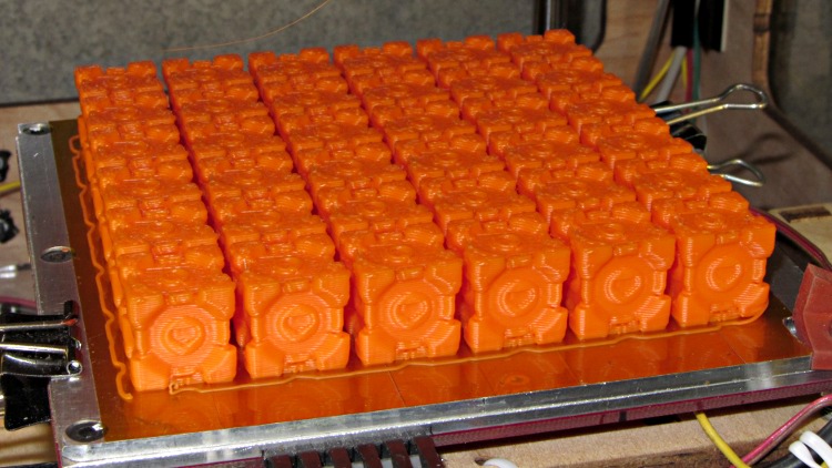 Scaling the cubes to about 15 mm on a side puts a 6×6 array neatly on the build plate. Takes nigh onto four hours to print all 36 of them at 30 mm/s print and 100 mm/s move… a bit over 6 minutes each.