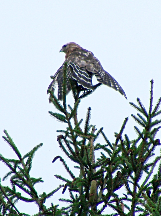 One of the Coopers Hawks that keep the rodents under control around here landed atop a pine tree and spread its wings to dry out: