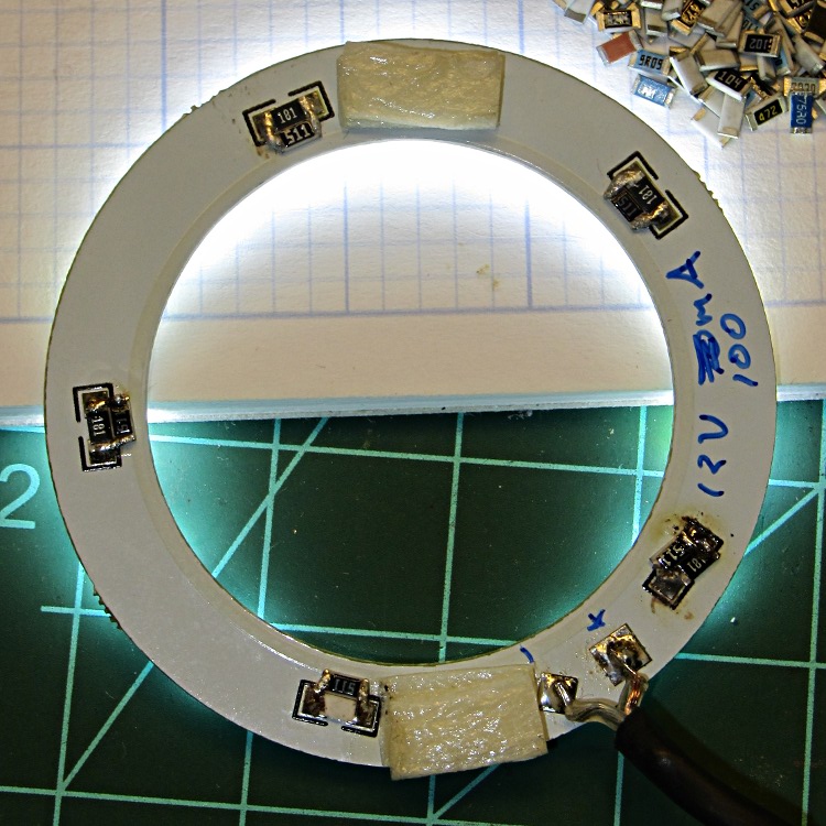 Paralleling a 510 Ω resistor with each of the 180 Ω resistors on the LED ring light around the macro lens holder boosted the LED string current from 15 to 20 mA: