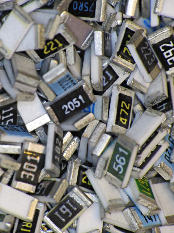 A hand-held picture of the pile of SMD resistors (which willingly produced four of the five resistors and required enhanced interrogation to extract the last one):