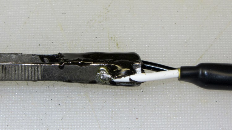 I chopped off the tweezer joint with a bolt cutter, scuffed up the steel with a file, soldered the cable wires, cut a small wood block to fit, and epoxied the whole mess together: