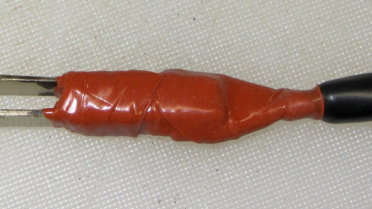 When the epoxy cured, a generous wrap of silicone tape hid most of the hackage. Two lengths of clear heatstink tubing insulate the handles from my sweaty fingers: