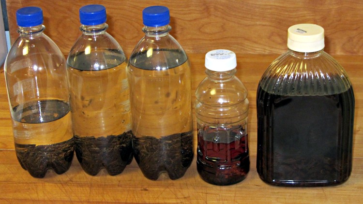 Although the recipes recommend daily shaking for a month before the brew reaches equilibrium, I’m sure this is one of those exponential diffusion deals that’s mostly done after a day or three. These two bottles show the concentration on the next morning, after and before shaking: