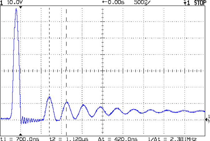 A better view of the snubbed peak shows it’s all over in about 400 ns: